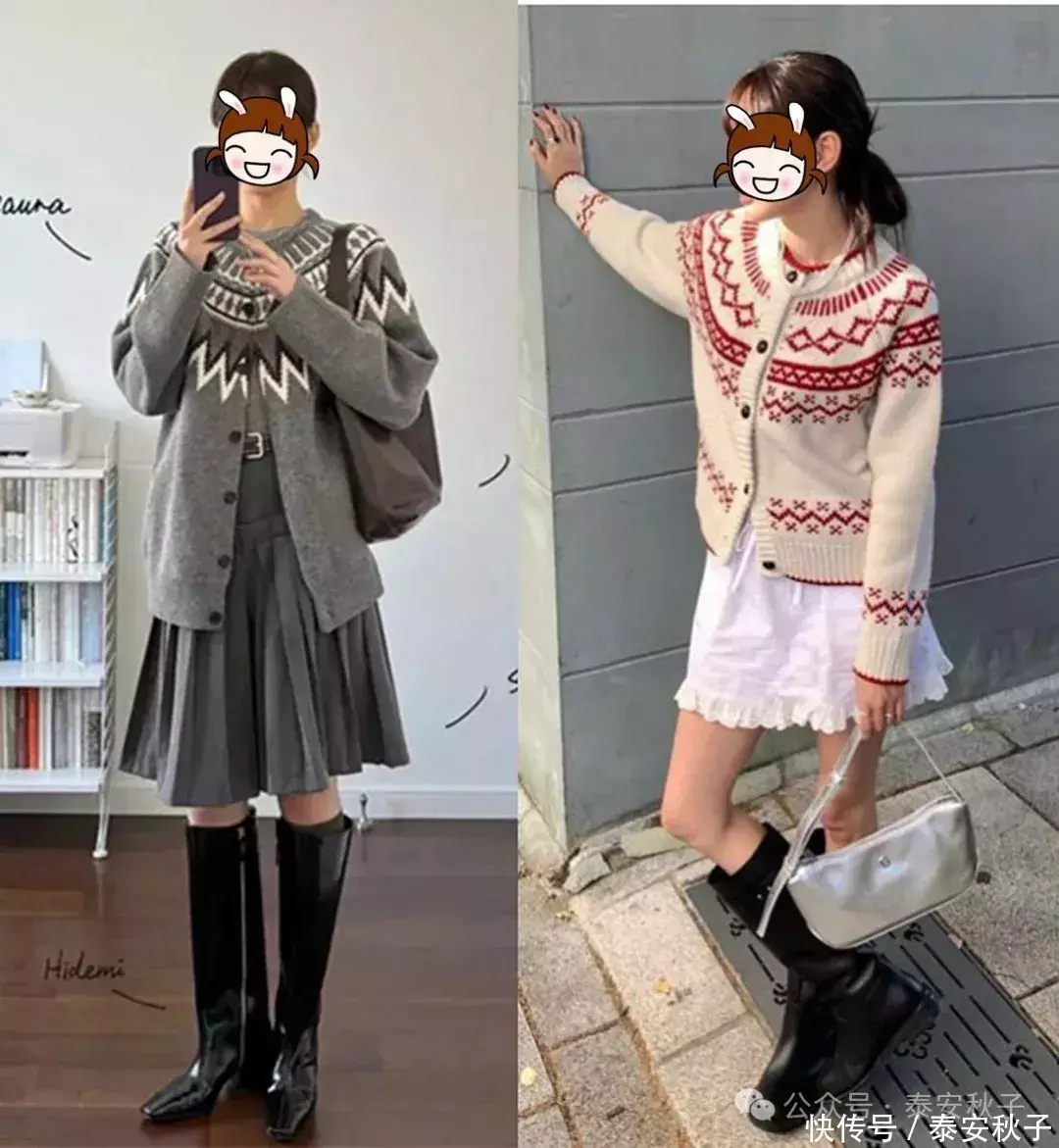 浅灰调的费尔岛外套和同色的短款百褶裙的叠穿,既展现了腿部线条又不会过于暴露,穿双黑色的骑士靴,就是妥妥的都市摩登女郎范儿。