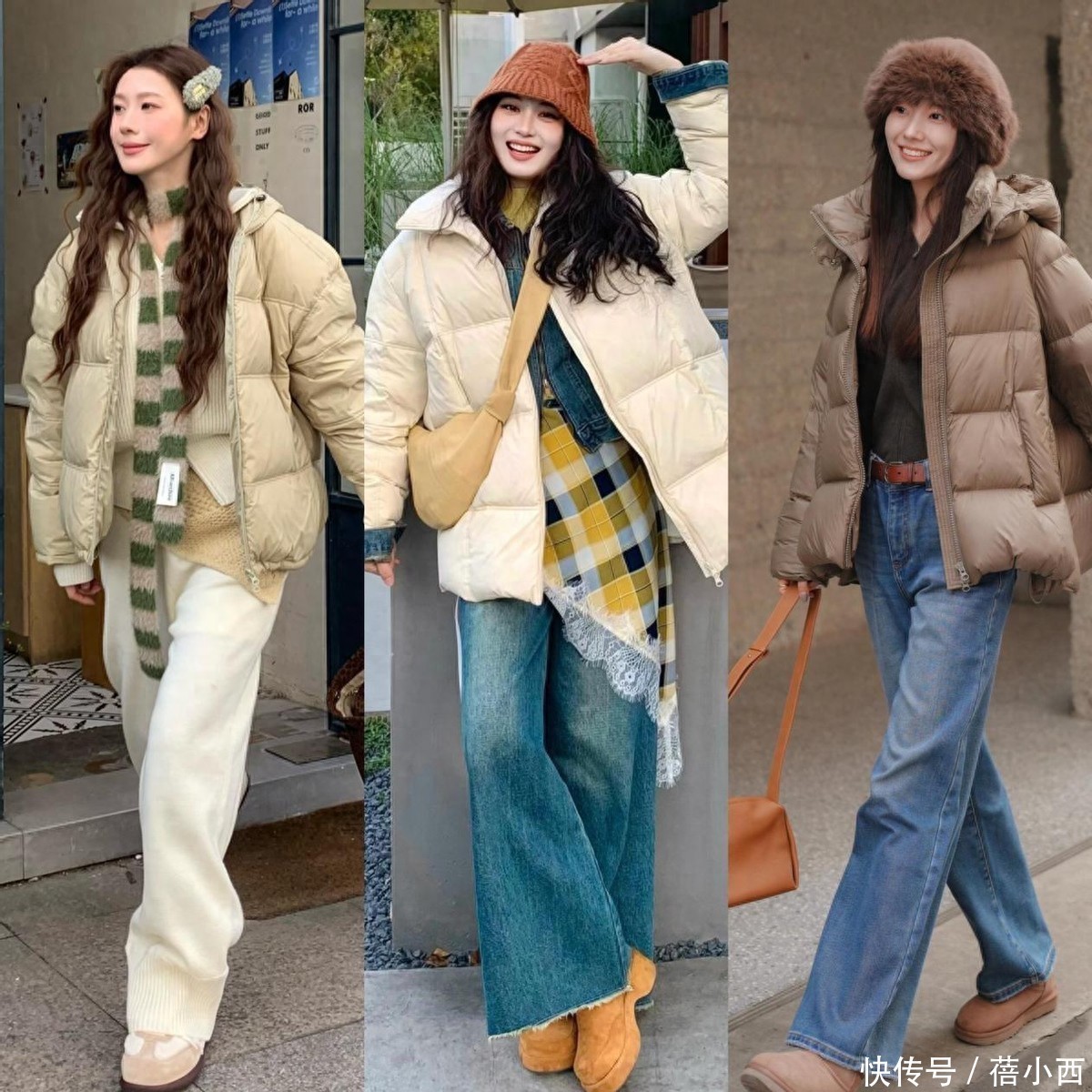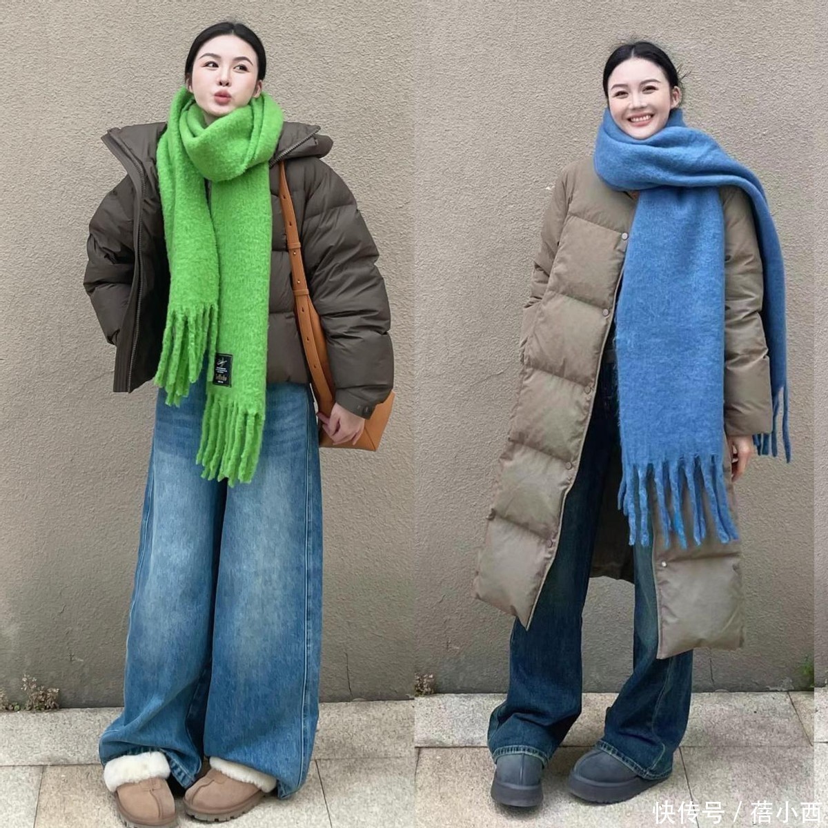 长款的羽绒服搭配阔腿牛仔裤比短羽绒服更保暖,适合零下的天气。