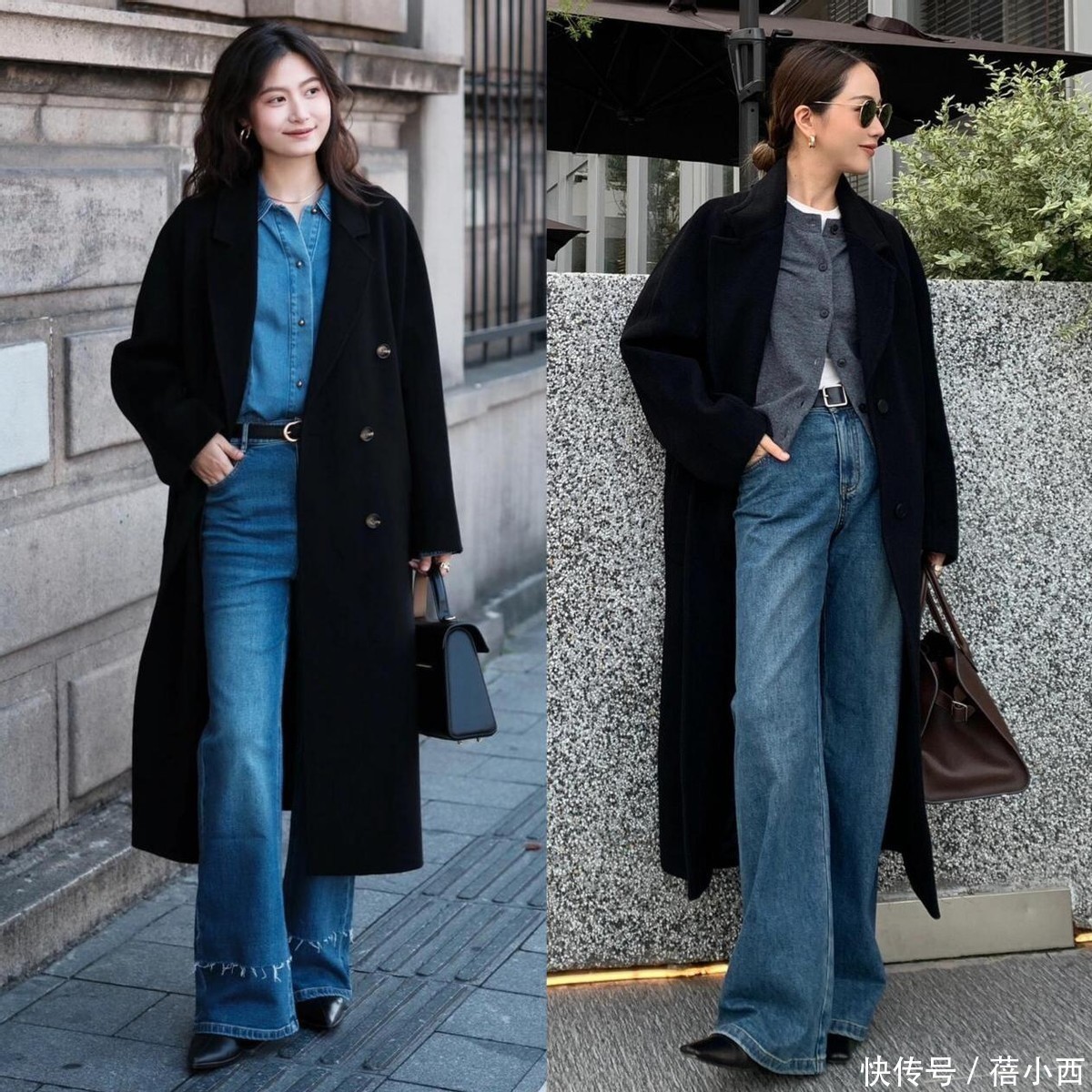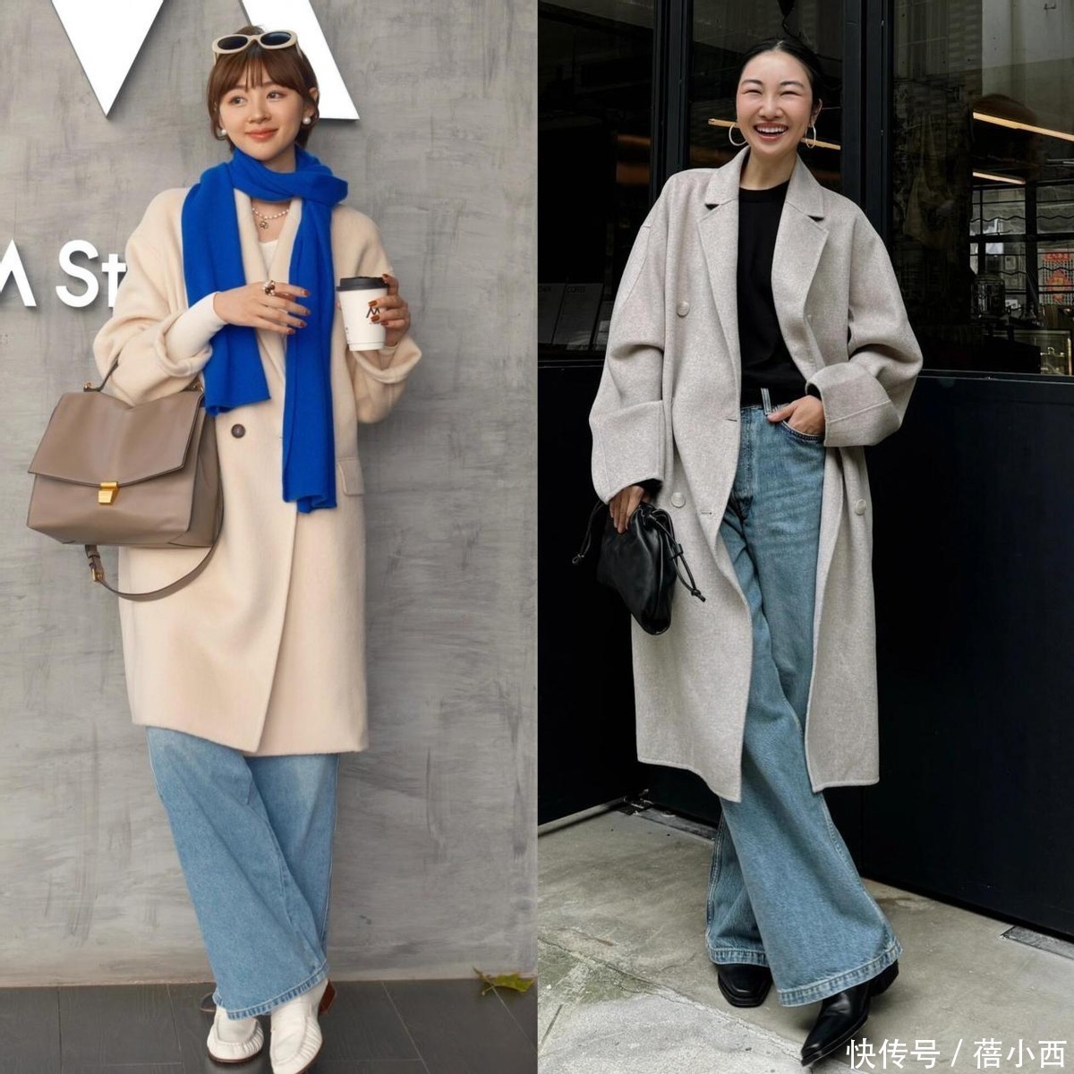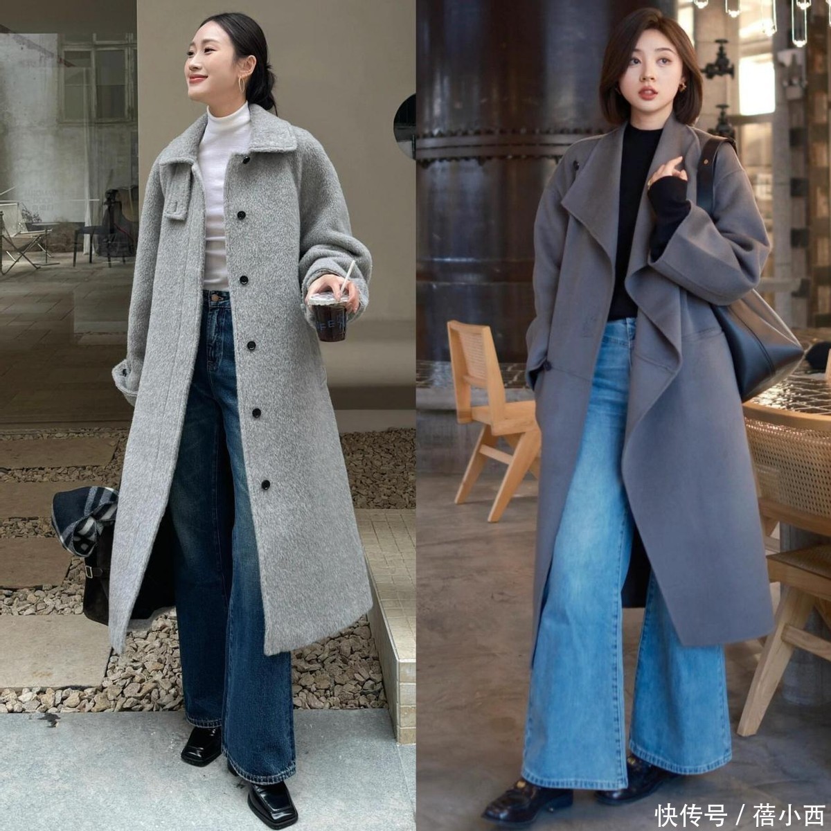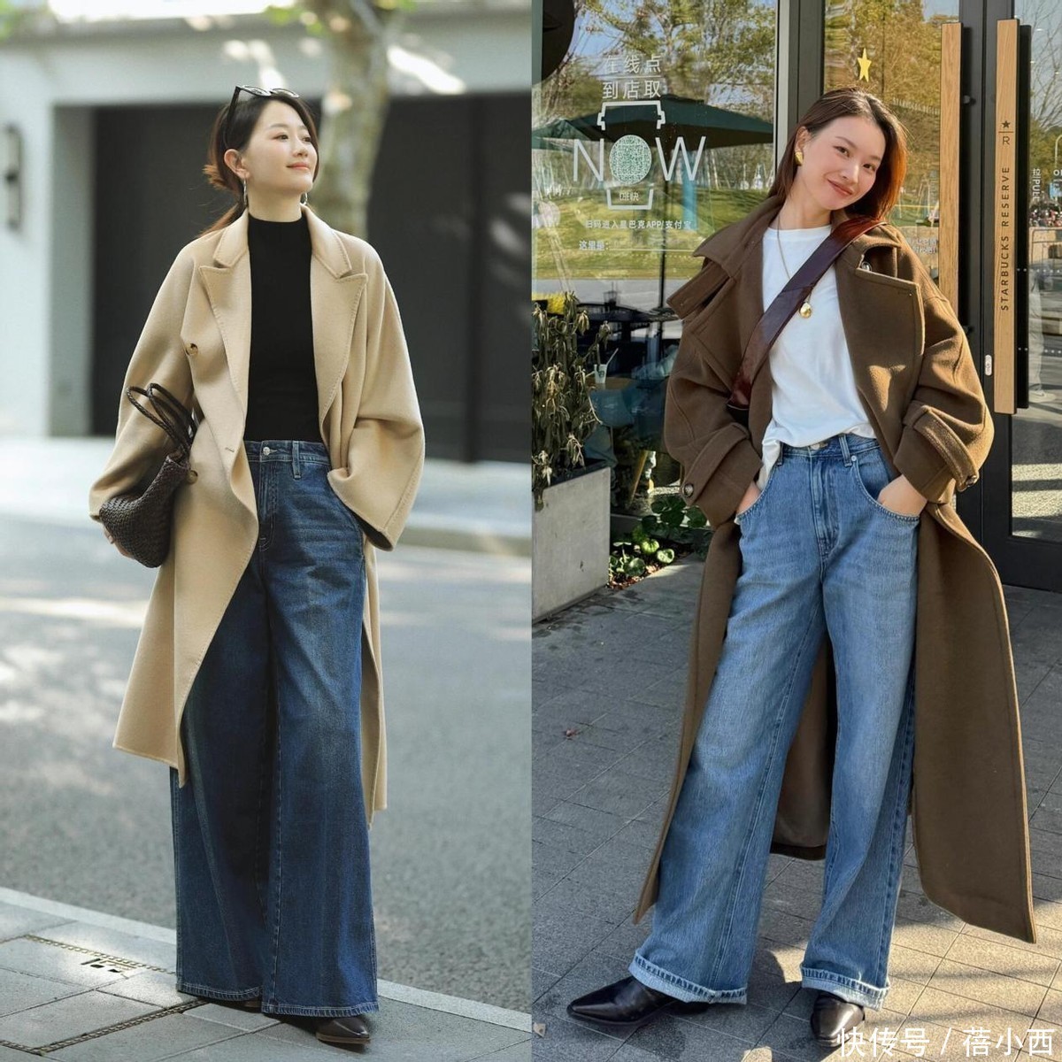 2,大衣配阔腿牛仔裤