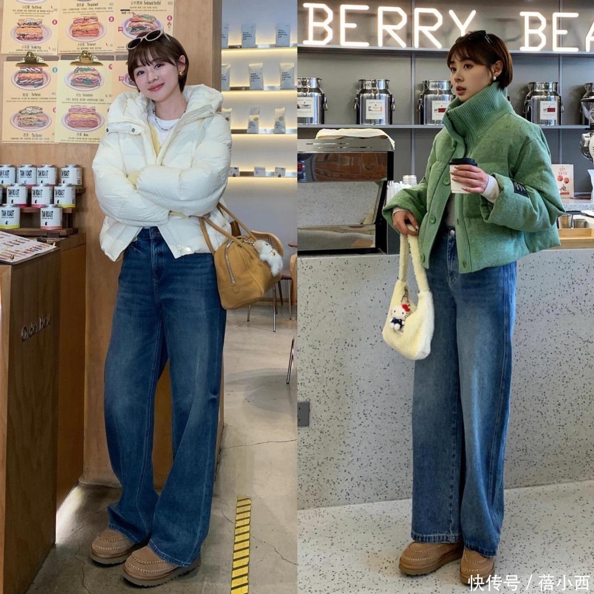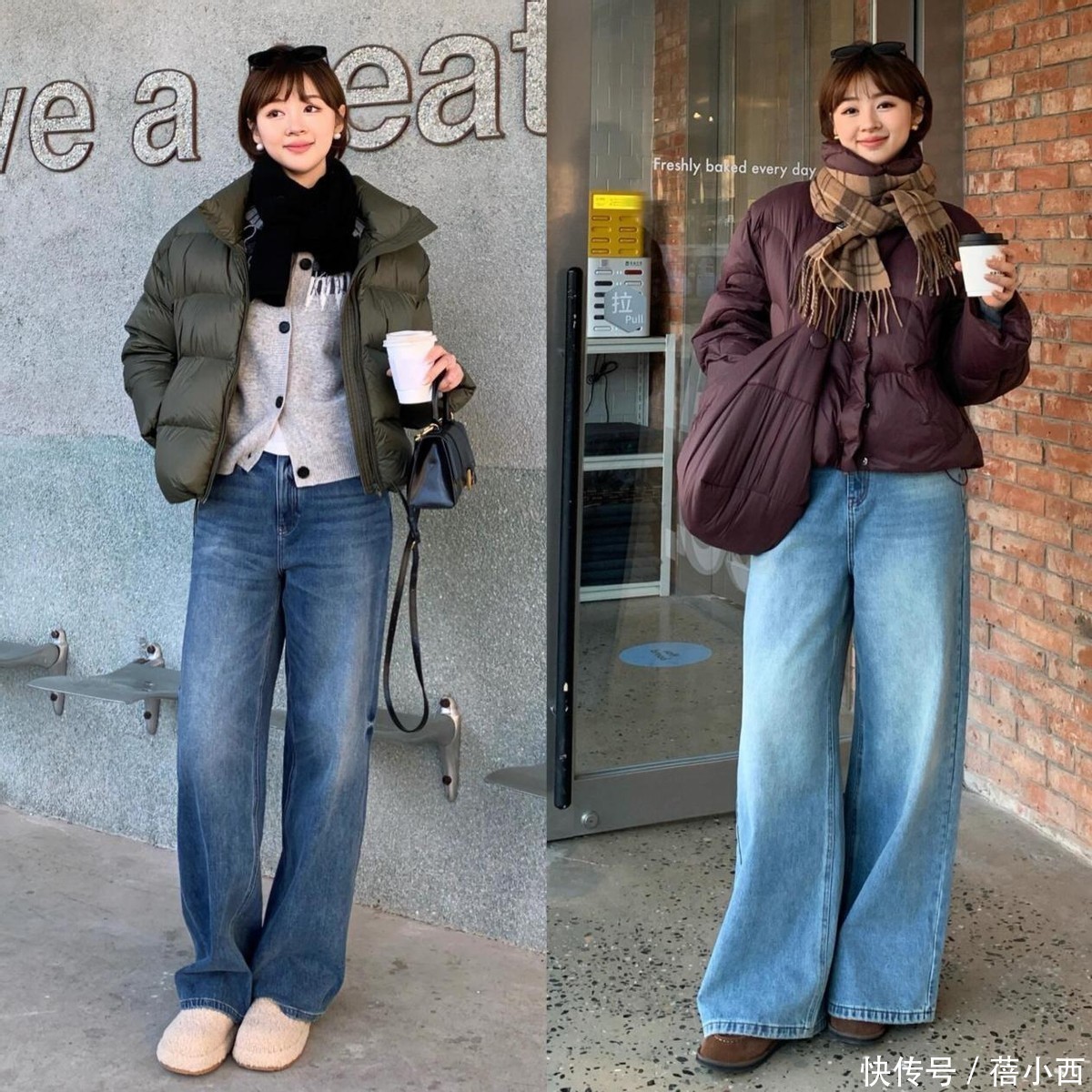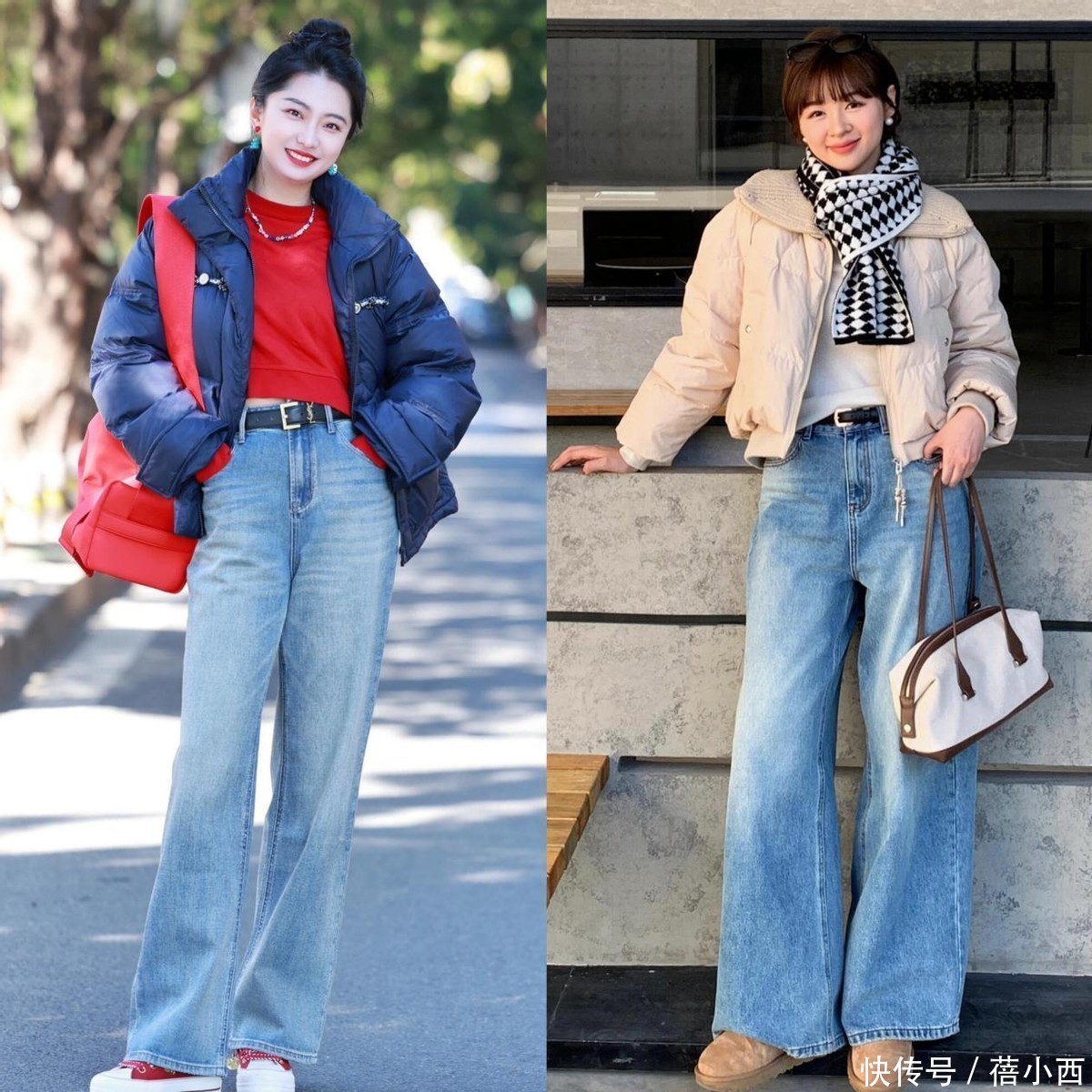 1,羽绒服搭配阔腿牛仔裤