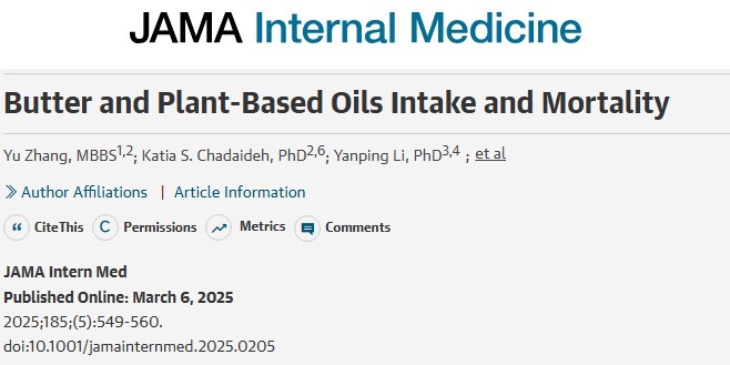 类似研究还有很多,其中发表在《JAMA Internal Medicine》期刊上一项大规模队列研究,通过跟踪221054名参与者分别分为摄入黄油和植物油组,在经过33年的调查记录,发现黄油摄入组全因死亡率和癌症死亡率更高,而植物油摄入组则表现相反,建议用植物油代替动物油,以降低早死风险。